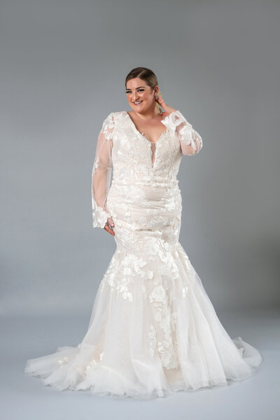 Floral lace applique with sequins detail, layered tulle mermaid skirt, full train.